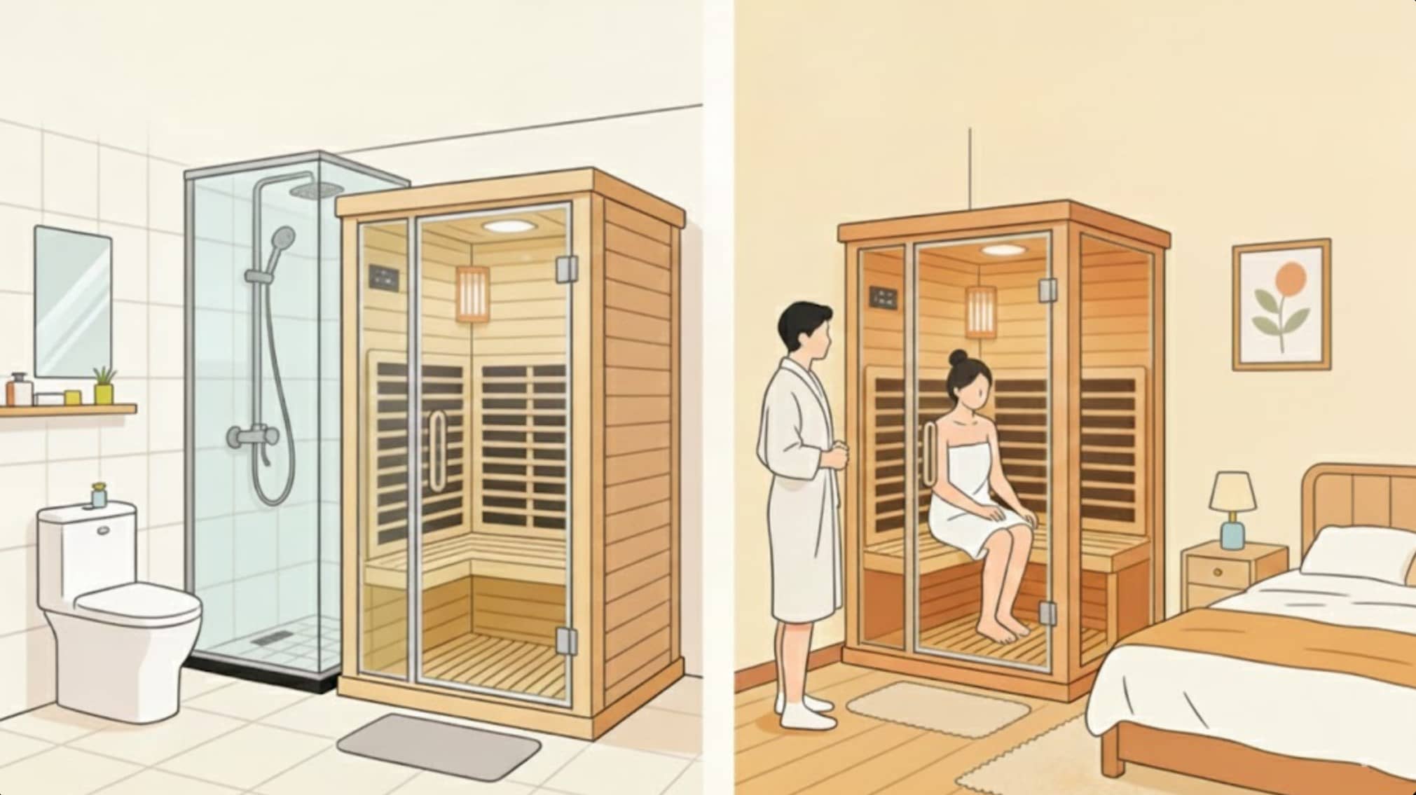 Spás Suiteála: Éilíonn saunas gaile soláthar uisce forchoimeádta agus píopaí draenála agus tá riachtanais arda acu maidir le haerdhíonacht spáis (oiriúnach le haghaidh athchóiriú seomra folctha nó limistéir thiomnaithe); ní gá saunas i bhfad-infridhearg soláthar uisce agus draenáil, ach foinse cumhachta. Níl ach 0.5-1㎡ de spás ag samhlacha beaga aon-duine agus is féidir iad a chur go solúbtha i seomraí codlata nó balcóiní.
